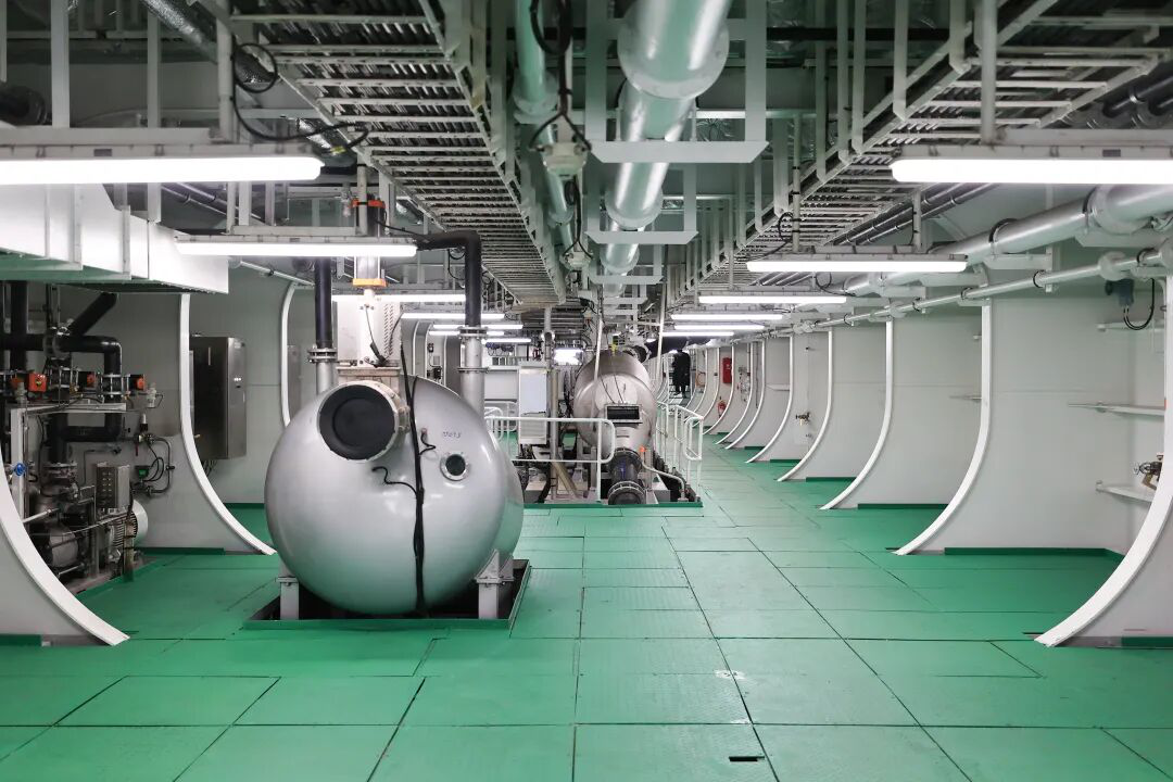 “苏海1号”的投产运营,标志着连云港市深远海养殖迈入了新阶段。养殖工船总长249.8米、型宽45米、型深21.6米,排水量13.2万吨,配备15个封闭式养殖舱,有效养殖水体达8.3万立方米。养殖工船通过全船智控系统实现水体、供氧、饲喂的精准调控,24小时内可完成16次水体交换,为三文鱼创造低应激、高标准的生长环境,其独特的游弋式生产能力,可主动追寻黄海冷水团等适宜水域,有效规避台风、赤潮等自然灾害风险。在产业链延伸方面,工船构建了“船载加工、岸海联动”的一站式工程体系,从起捕到冰鲜、速冻加工全程可控,结合高效冷链物流,最快24小时即可从养殖源头直达餐桌。
