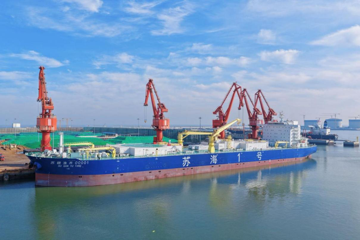 12月23日上午,全省首艘10万吨级大型养殖工船“苏海1号”在连云港赣榆港区新海湾码头启动鱼苗入舱作业,标志着“连云港工船养殖三文鱼项目”正式投产运营。