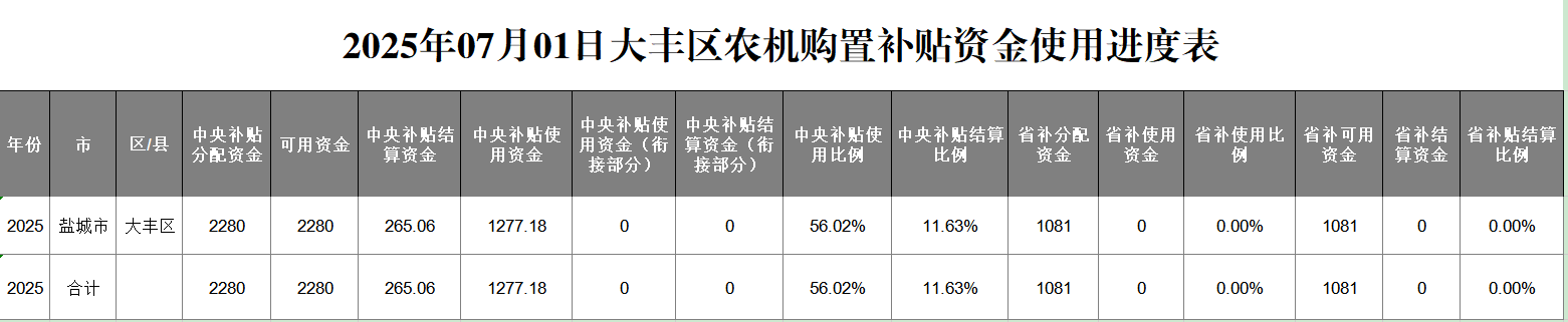 2025年07月01日大丰区农机购置补贴资金使用进度表