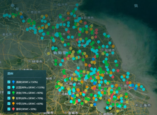 土壤墒情评价标准:涝渍(相对含水量≥150%);过湿(90%≤相对含水量<150%);适宜(70%≤相对含水量<90%);轻旱(60≤相对含水量<70%);中旱(50≤相对含水量<60%);重旱(相对含水量<50%)。